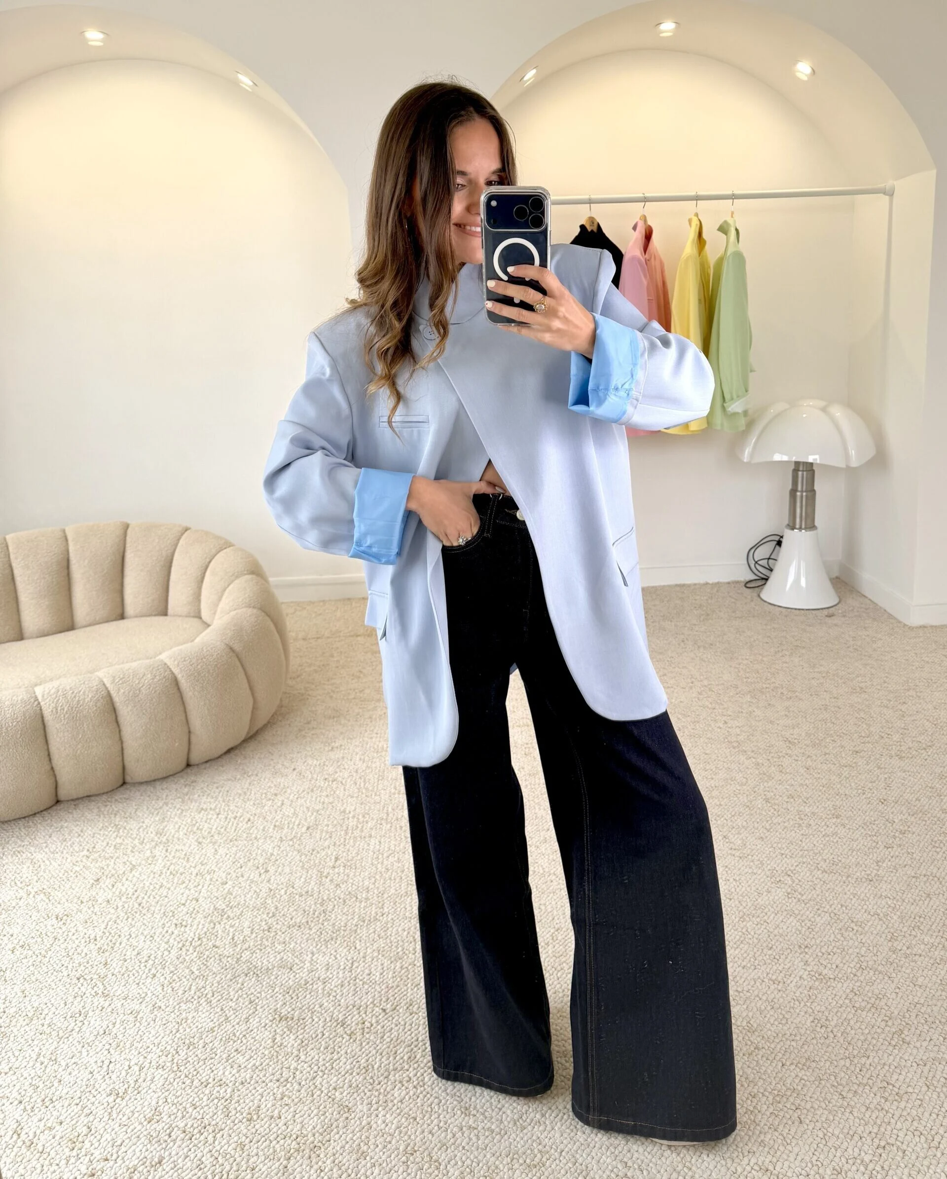 Blazer ouvert bleu oversize. Col montant avec bouton.