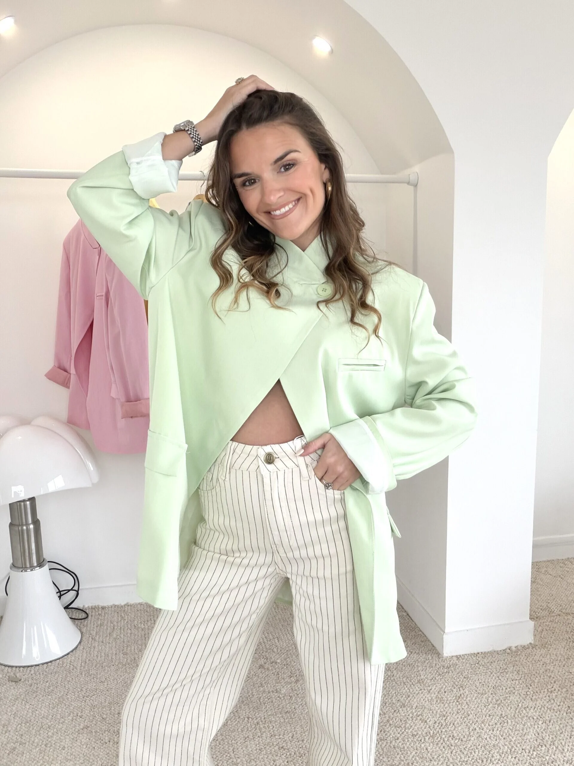 Blazer ouvert  vert pastel  oversize. Col montant avec bouton.