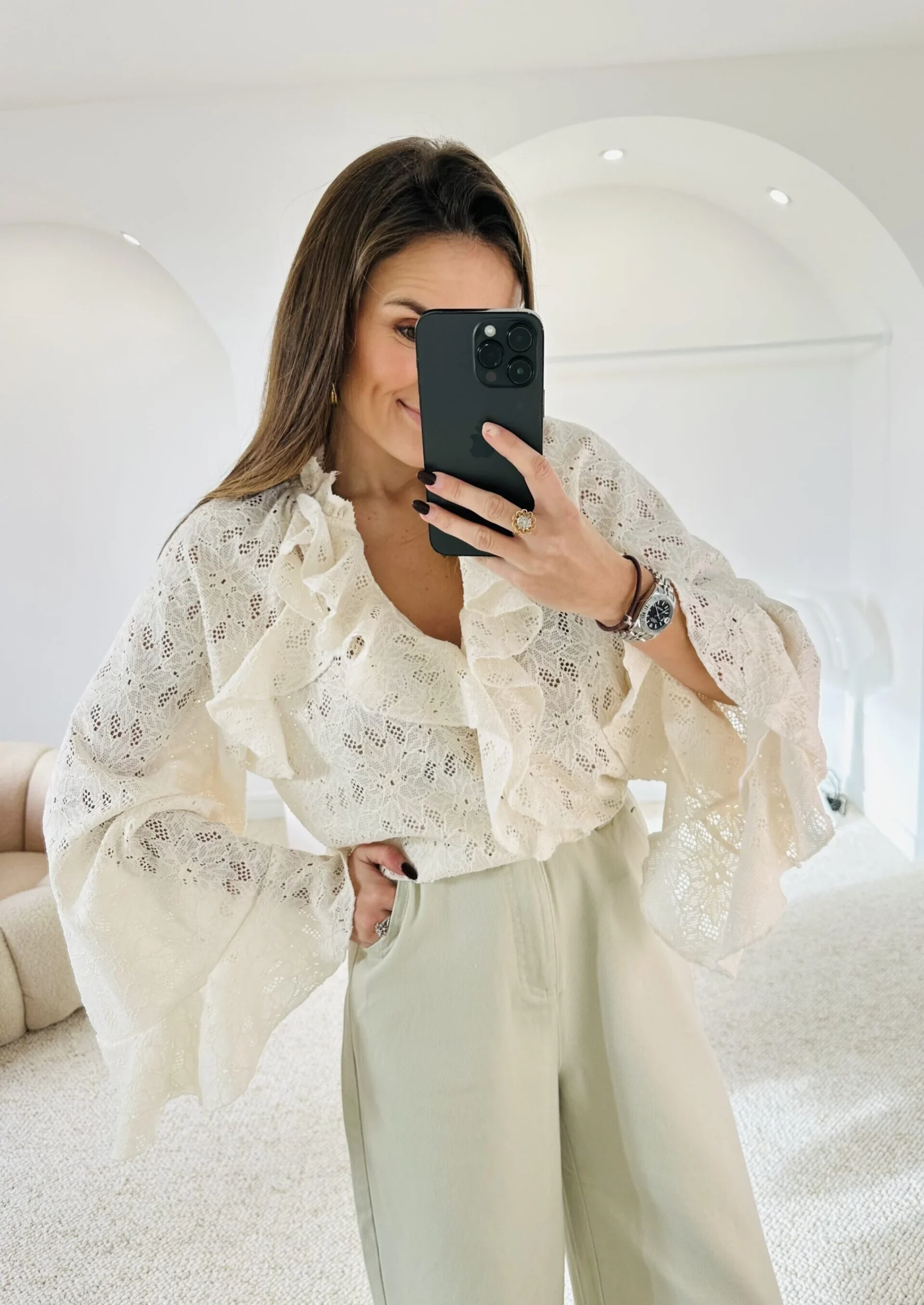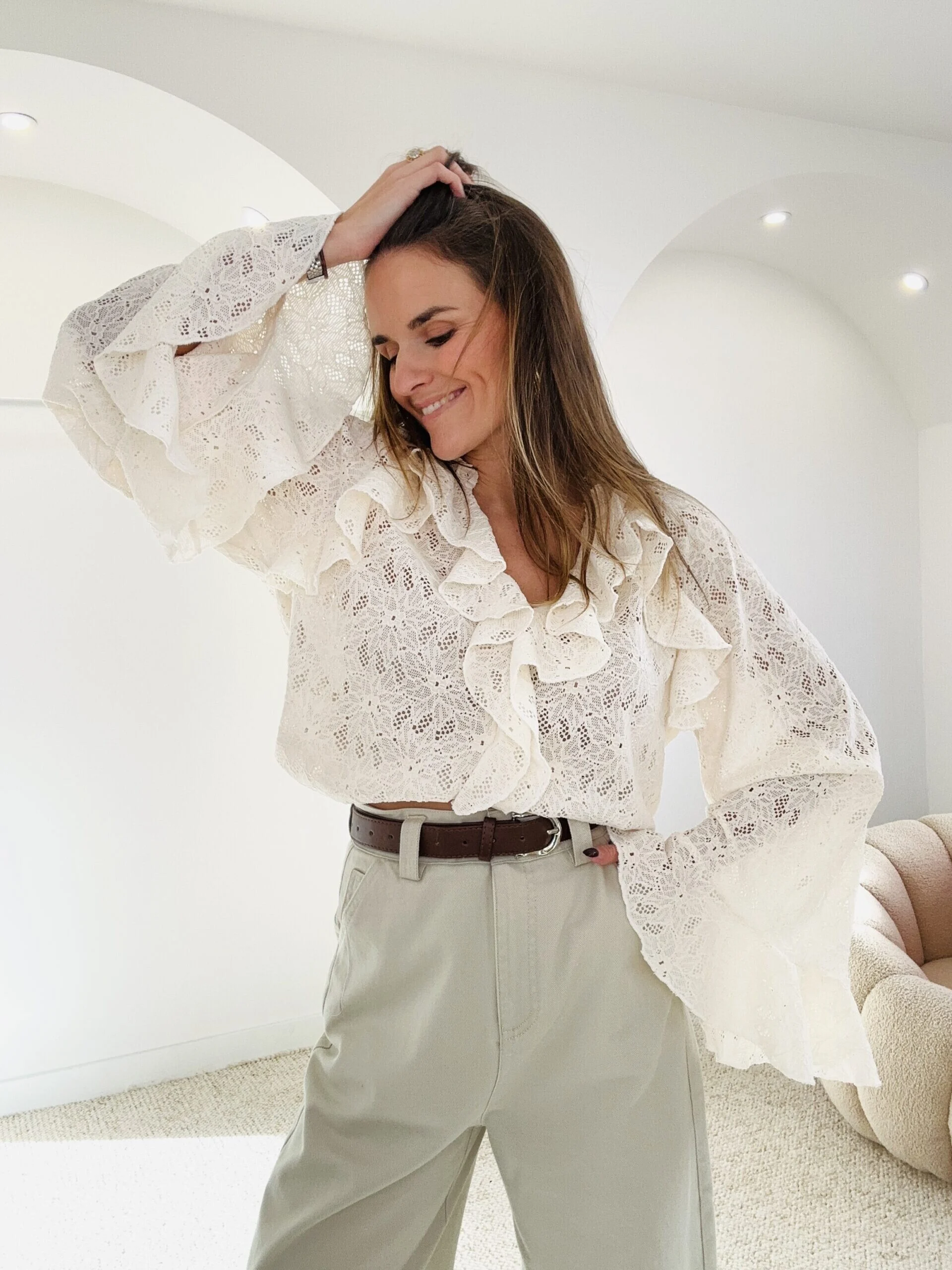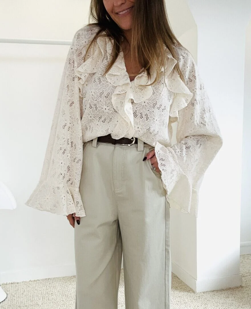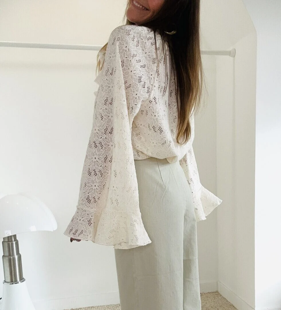 Cette magnifique blouse en dentelle séduit par son allure féminine et raffinée. Son col à volants apporte une touche bohème. Les manches évasées donnent du mouvement et beaucoup d’élégance à la silouhette.
