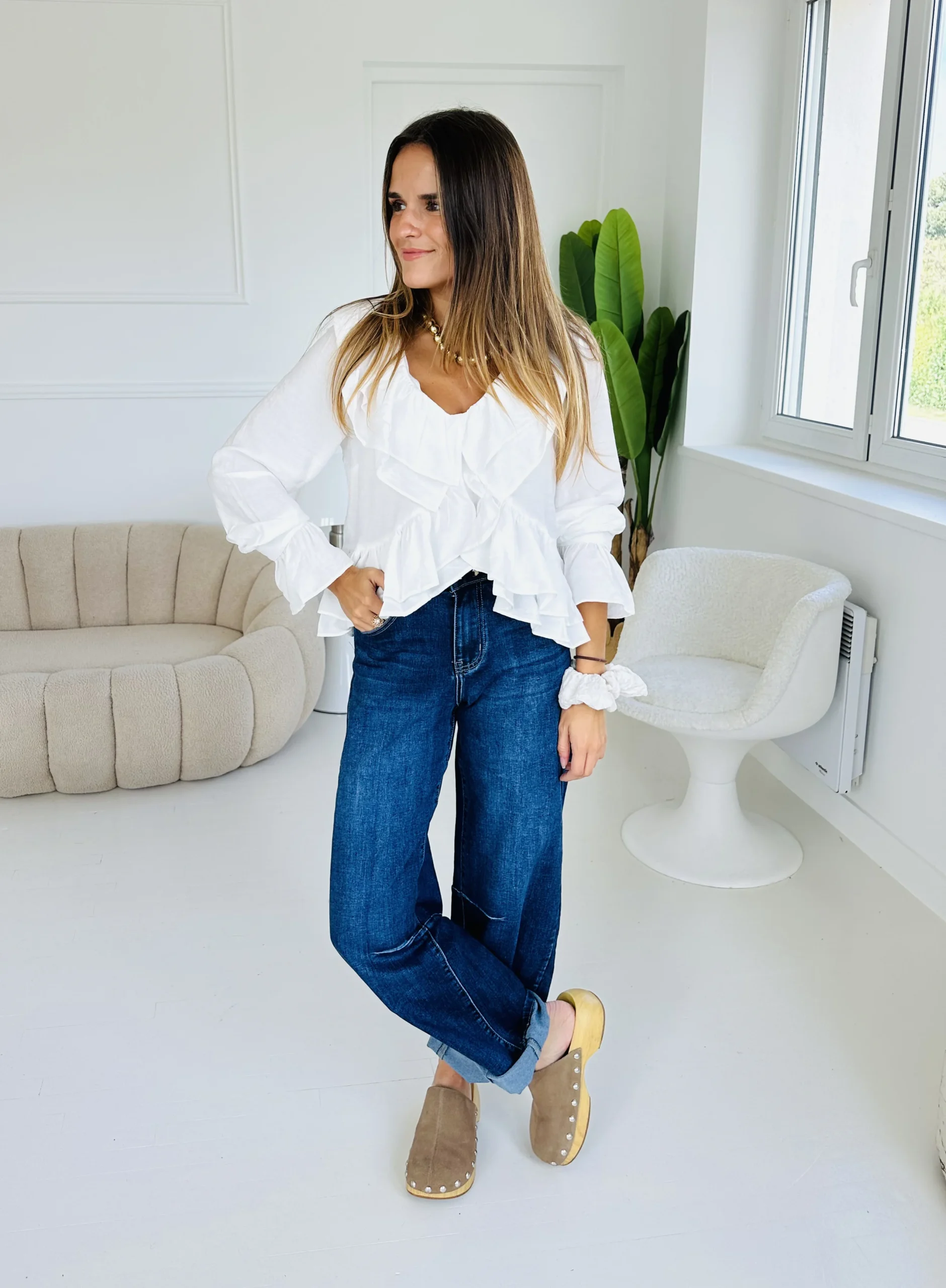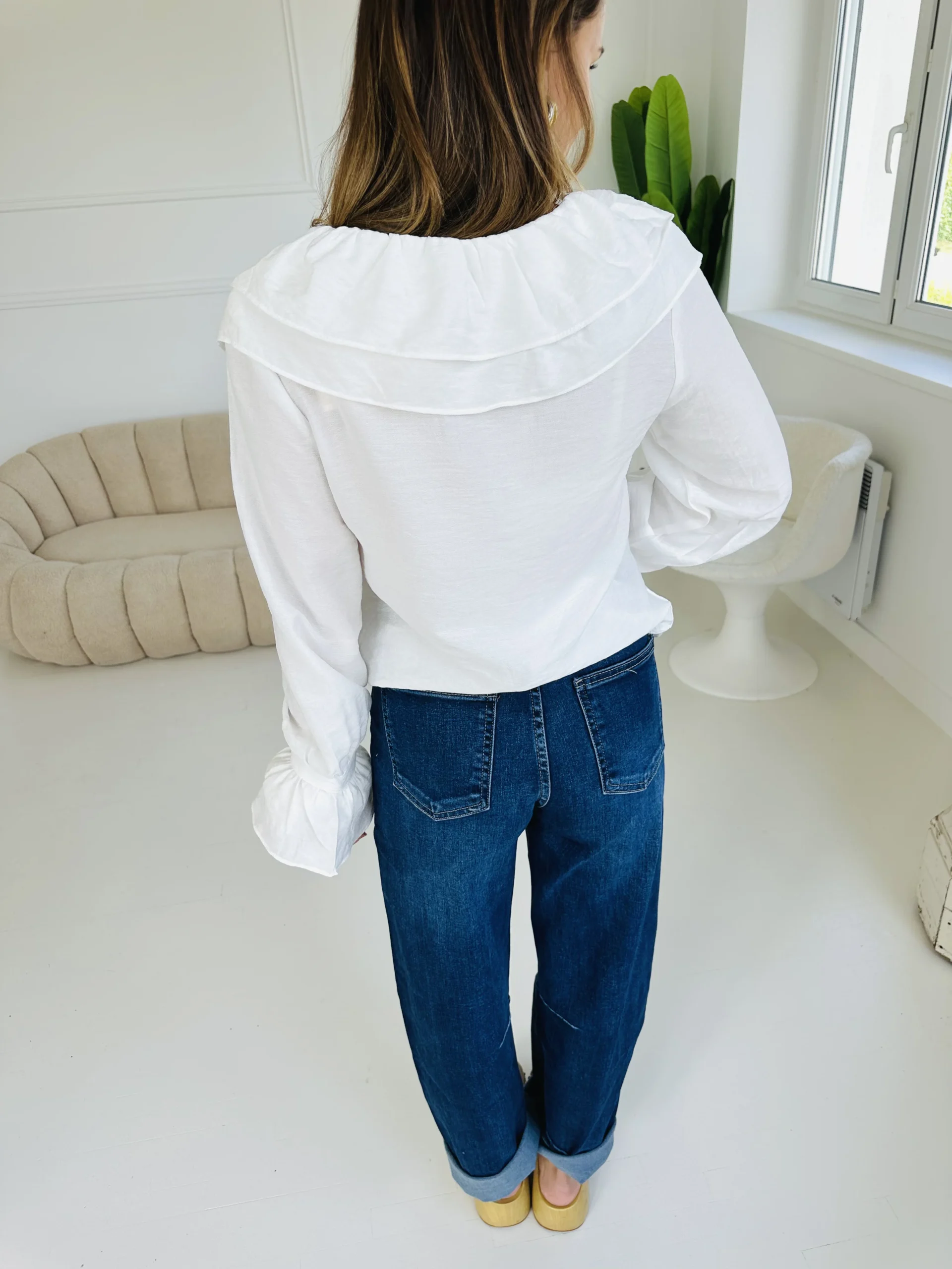 Blouse blanche à volants, plus courte sur l’avant, décolleté en V.