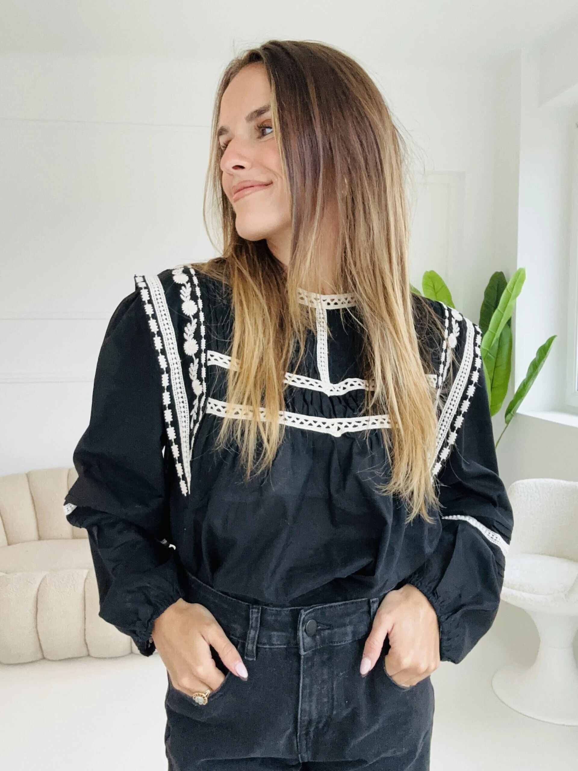 Blouse noire à broderies blanches, (Emeline porte la S-M).