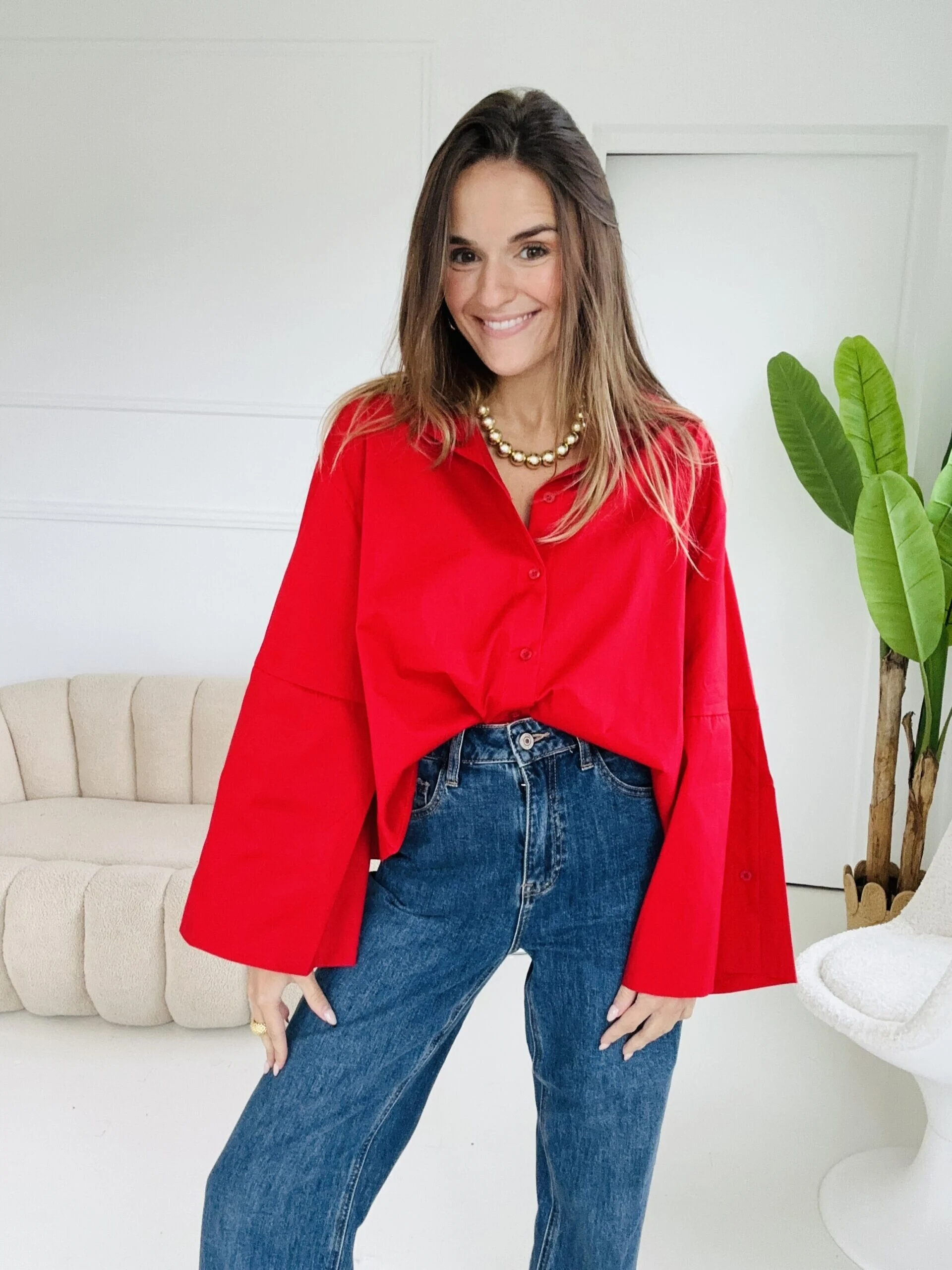 Chemisier rouge, détail manches évasées. (Emeline fait 1m57 et porte la taille S).