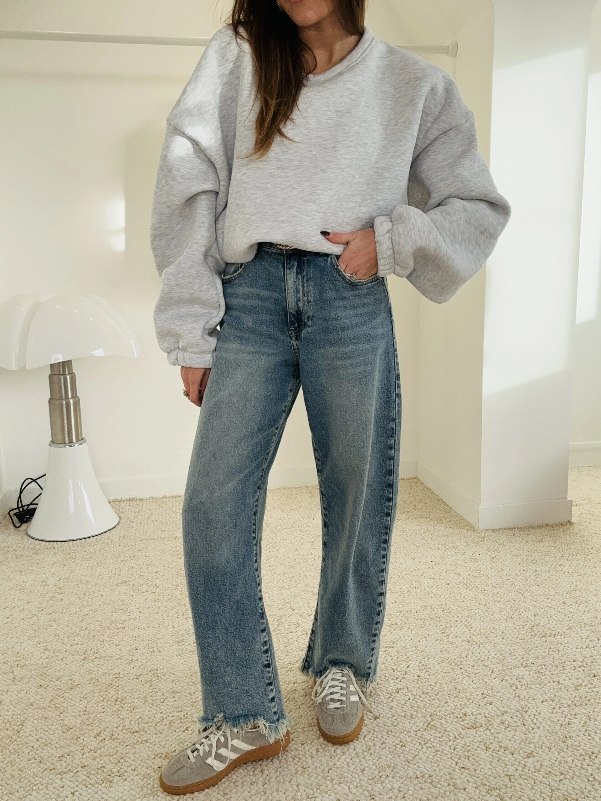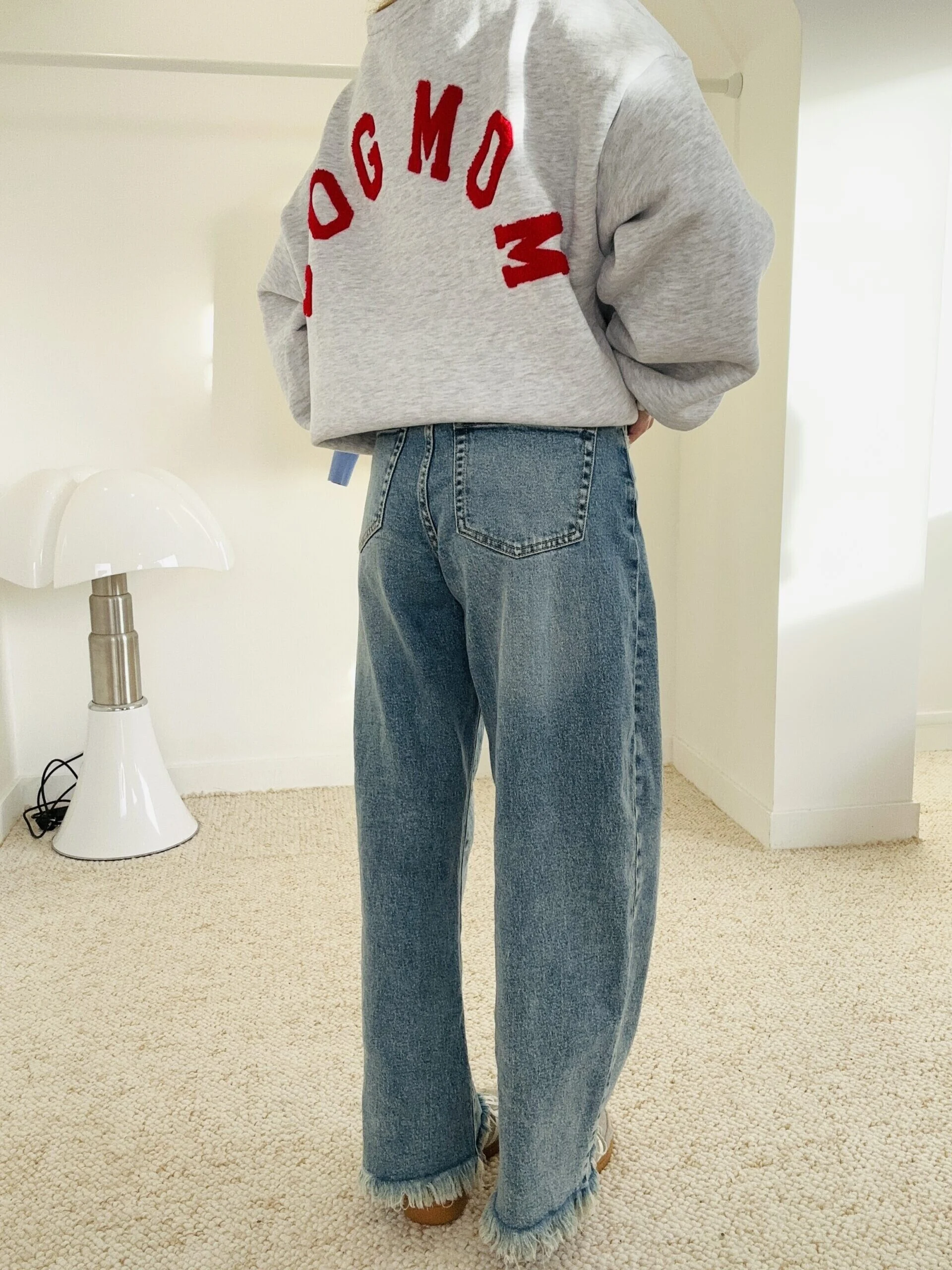 Jean taille haute, en denim, à la coupe droite légèrement évasée (ballon).