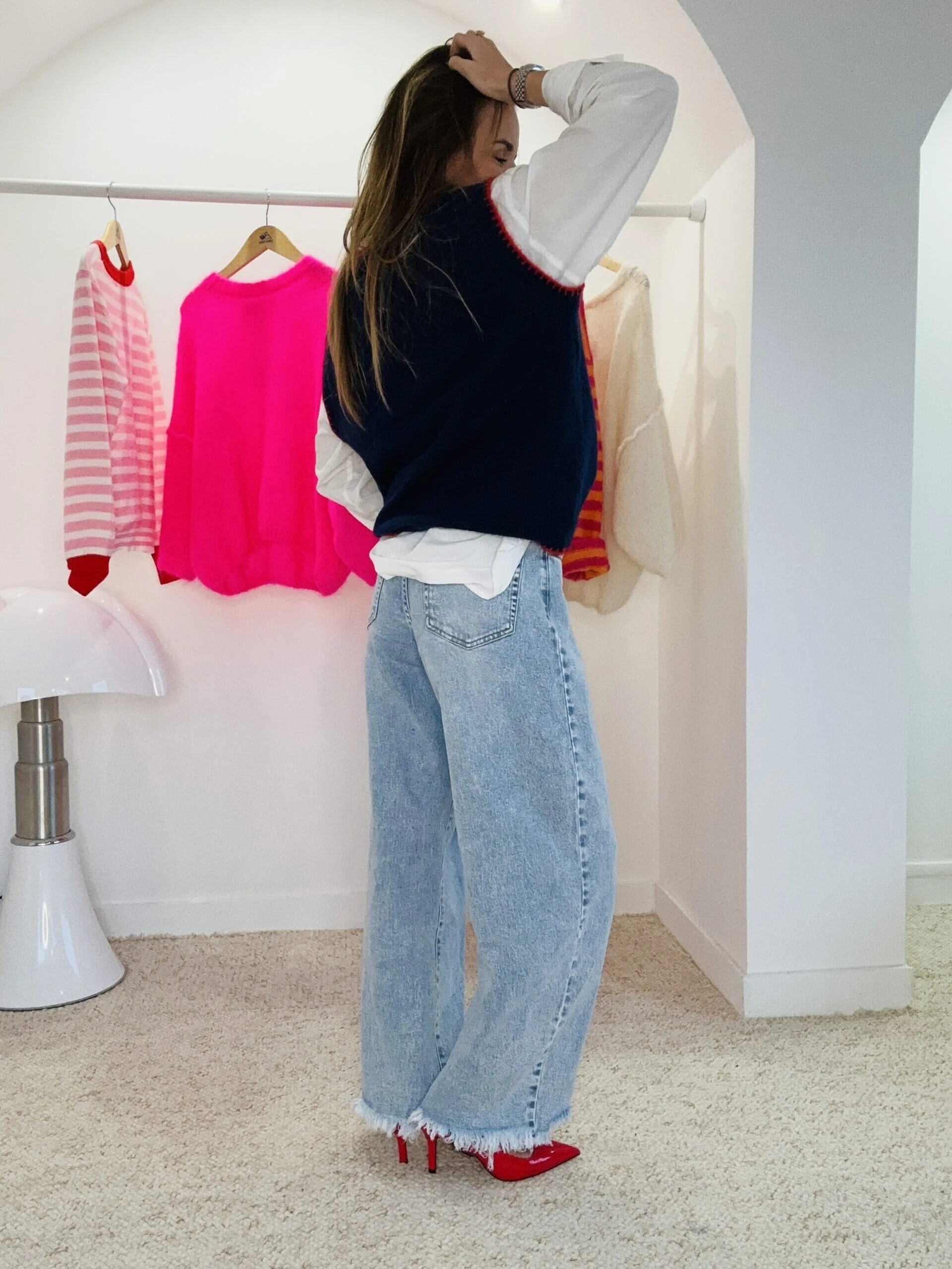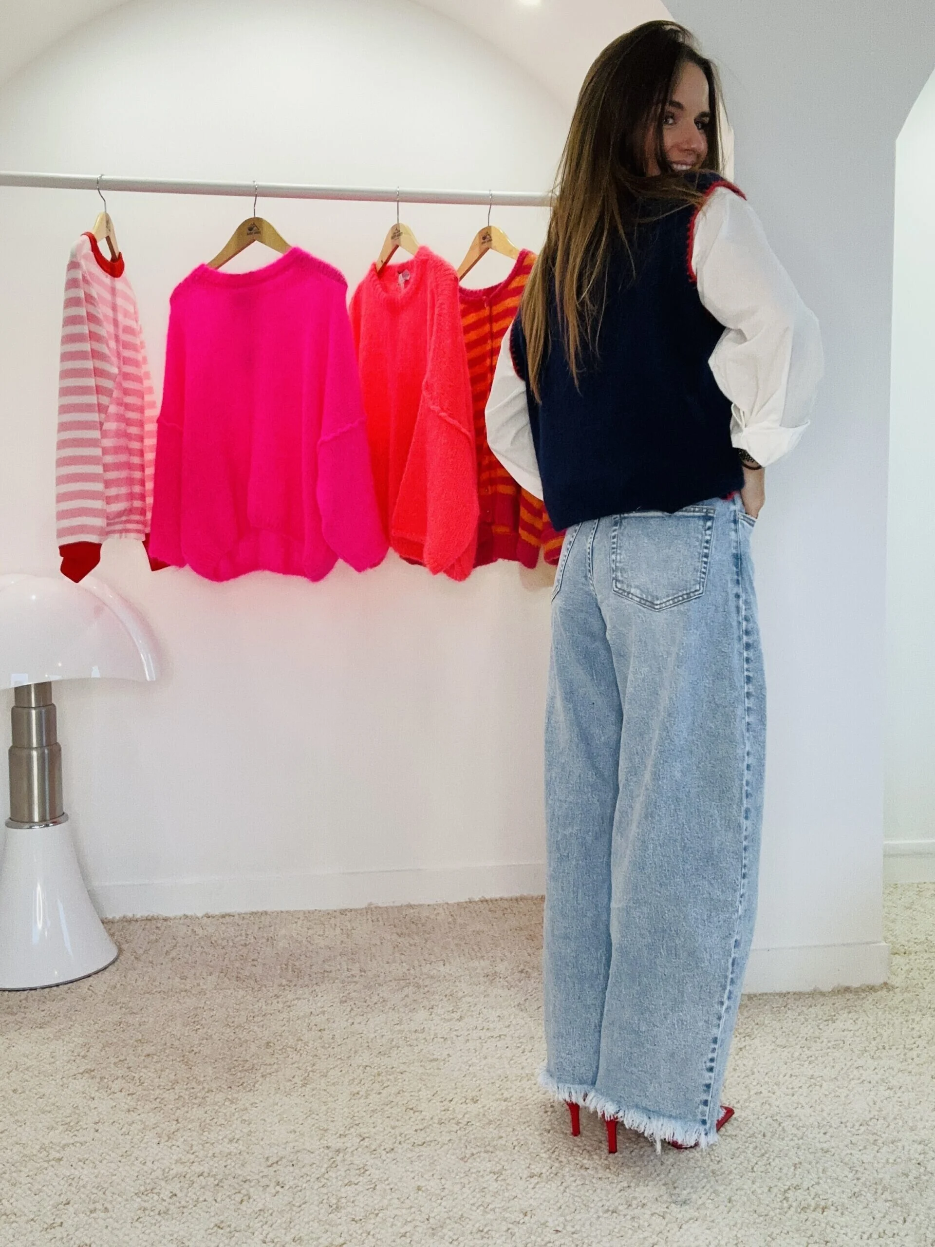 Jean taille haute en denim clair, à la coupe droite légèrement évasée (ballon).