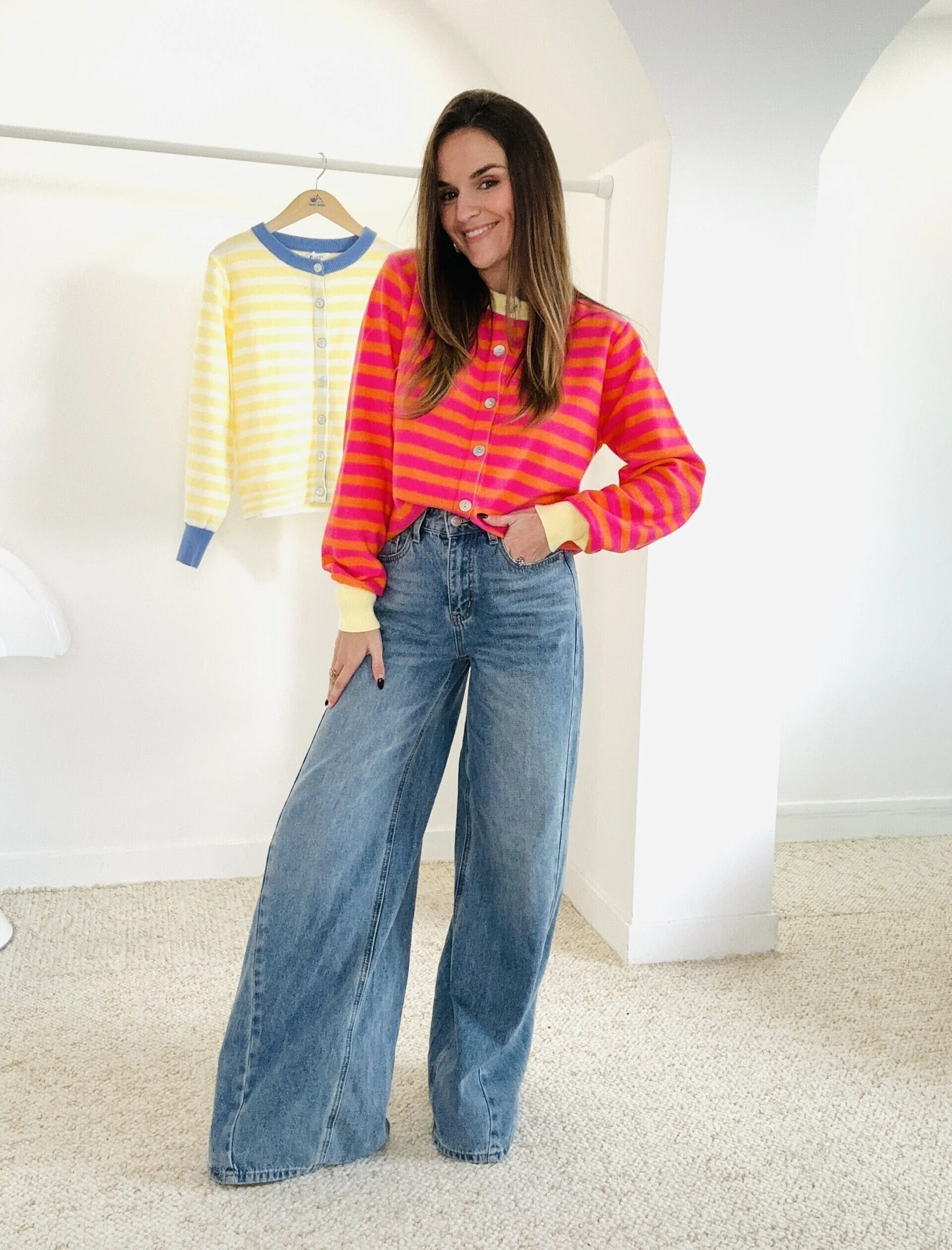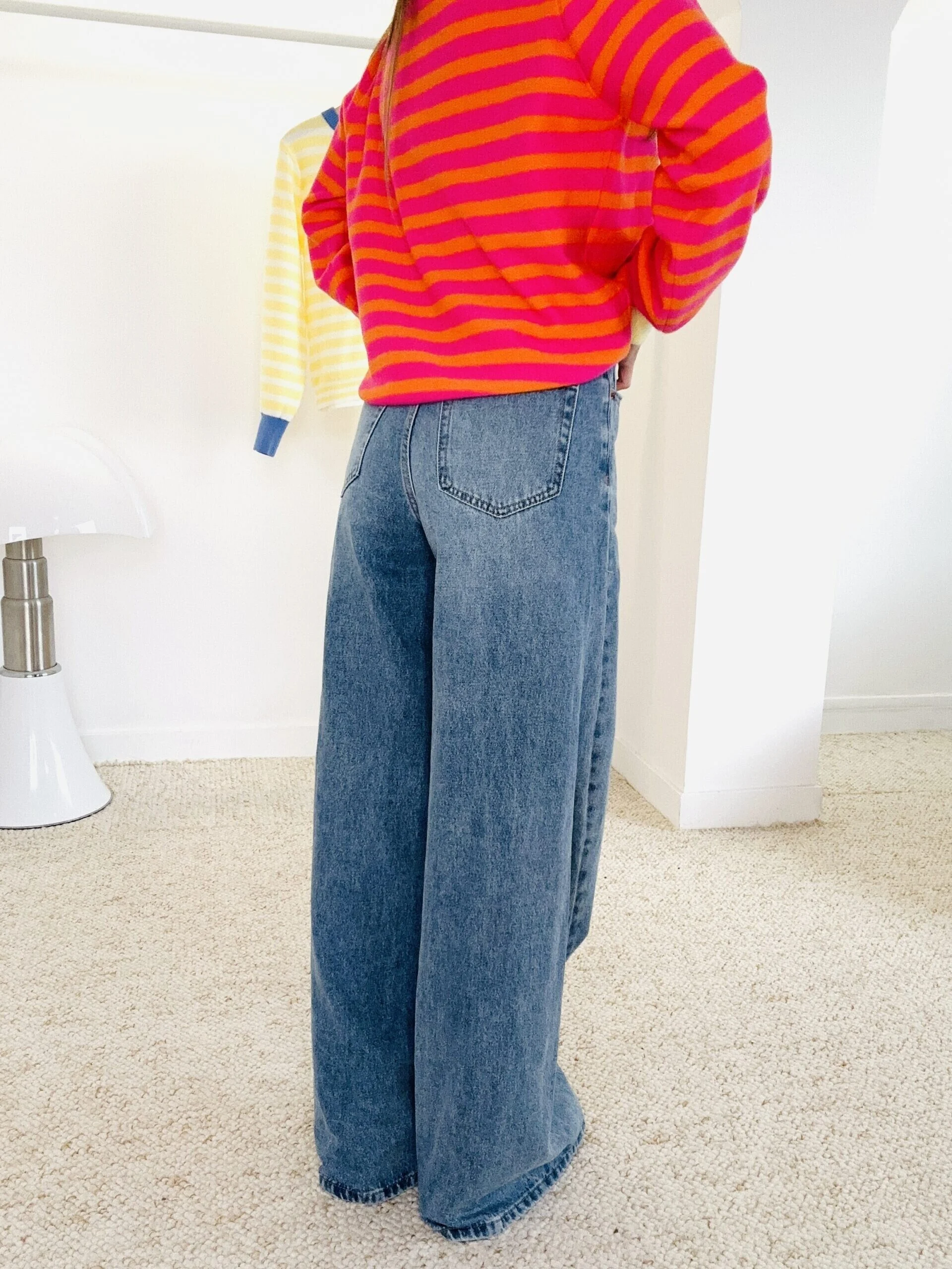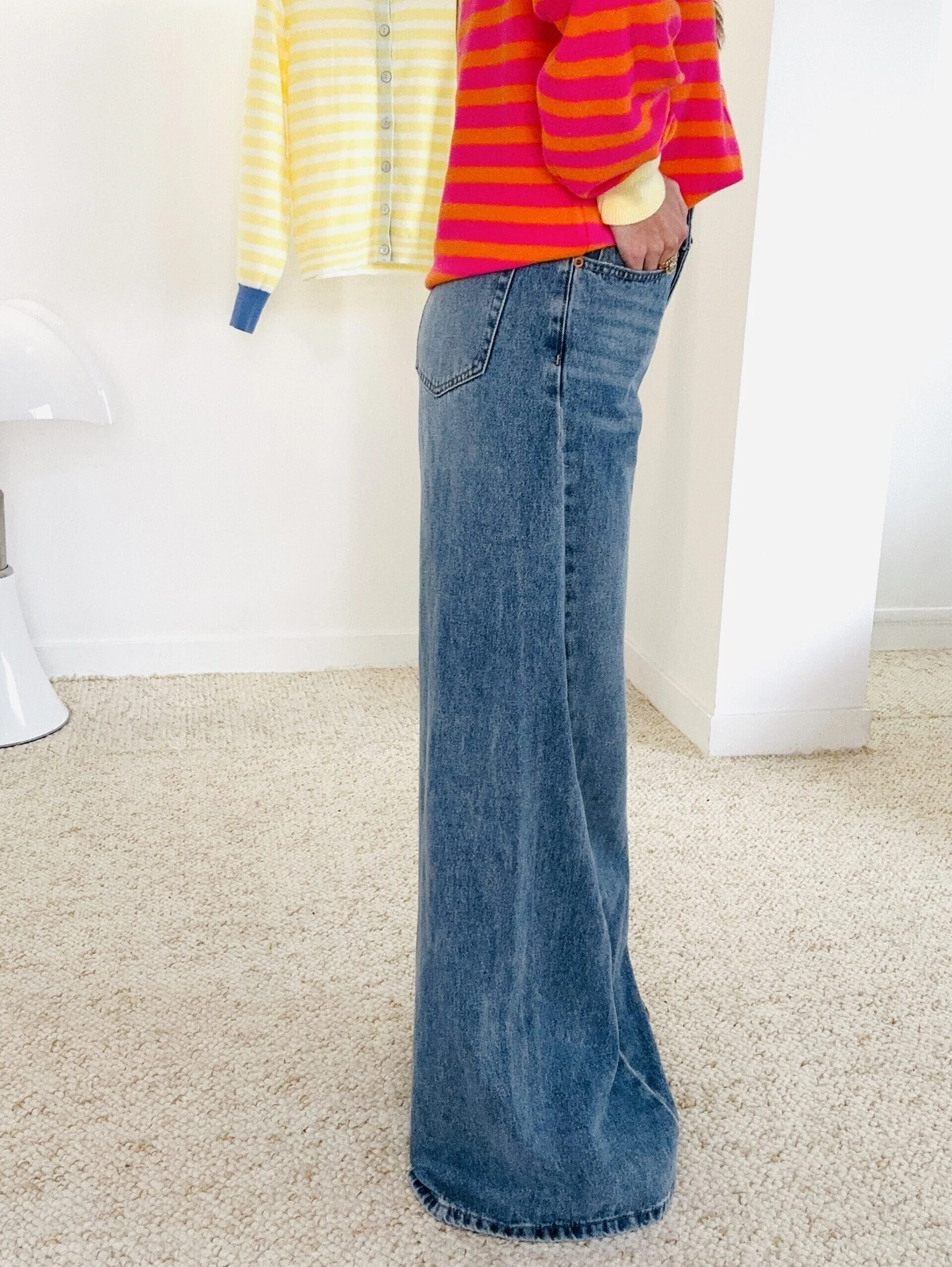 Jean long, taille haute, à jambes larges (coupe wide).