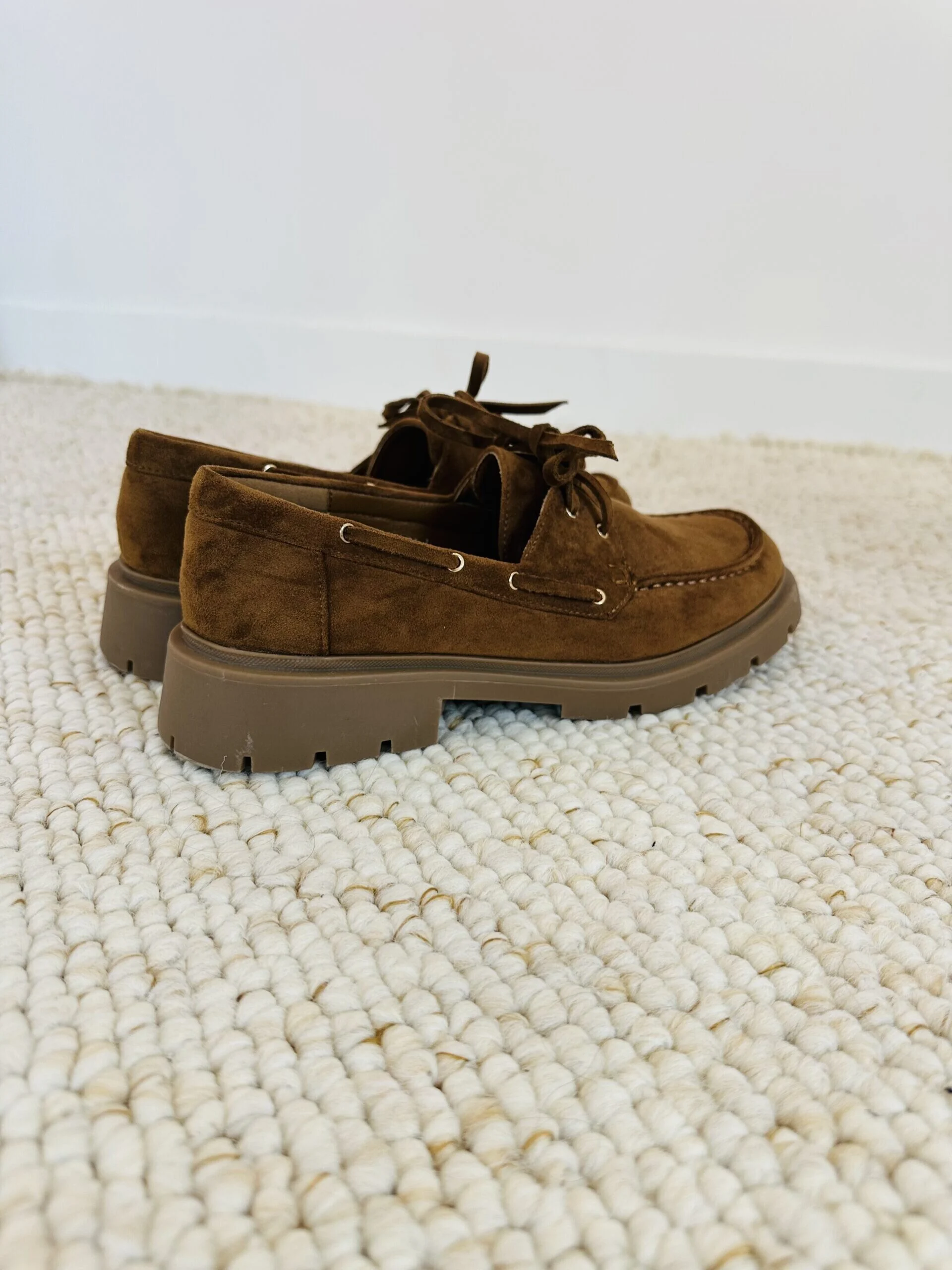 Mocassins Bateau en daim, camel, à semelles épaisses. Style chic et moderne. Elles sont faciles à porter au quotidien avec un jean, une jupe et même une robe.