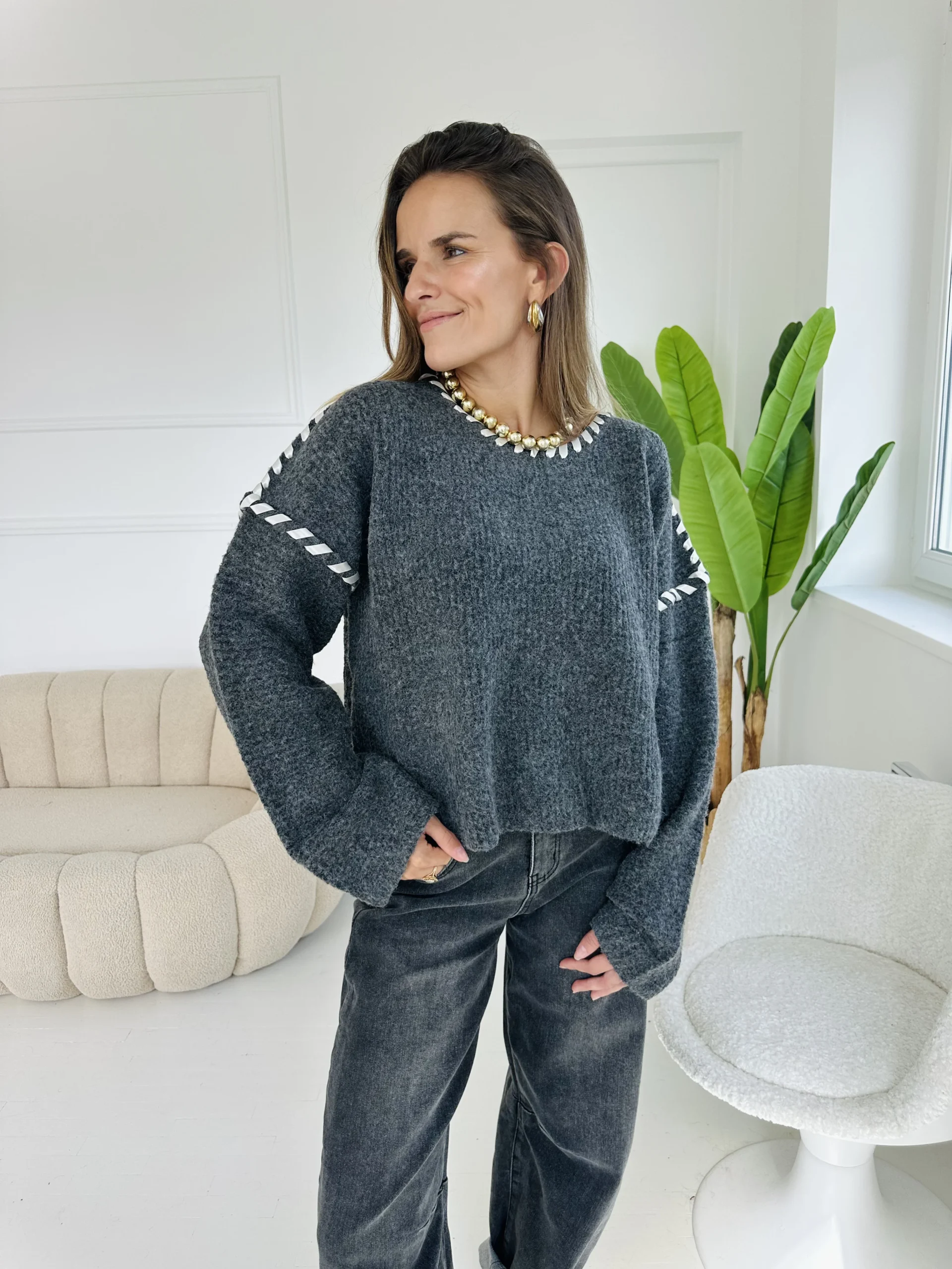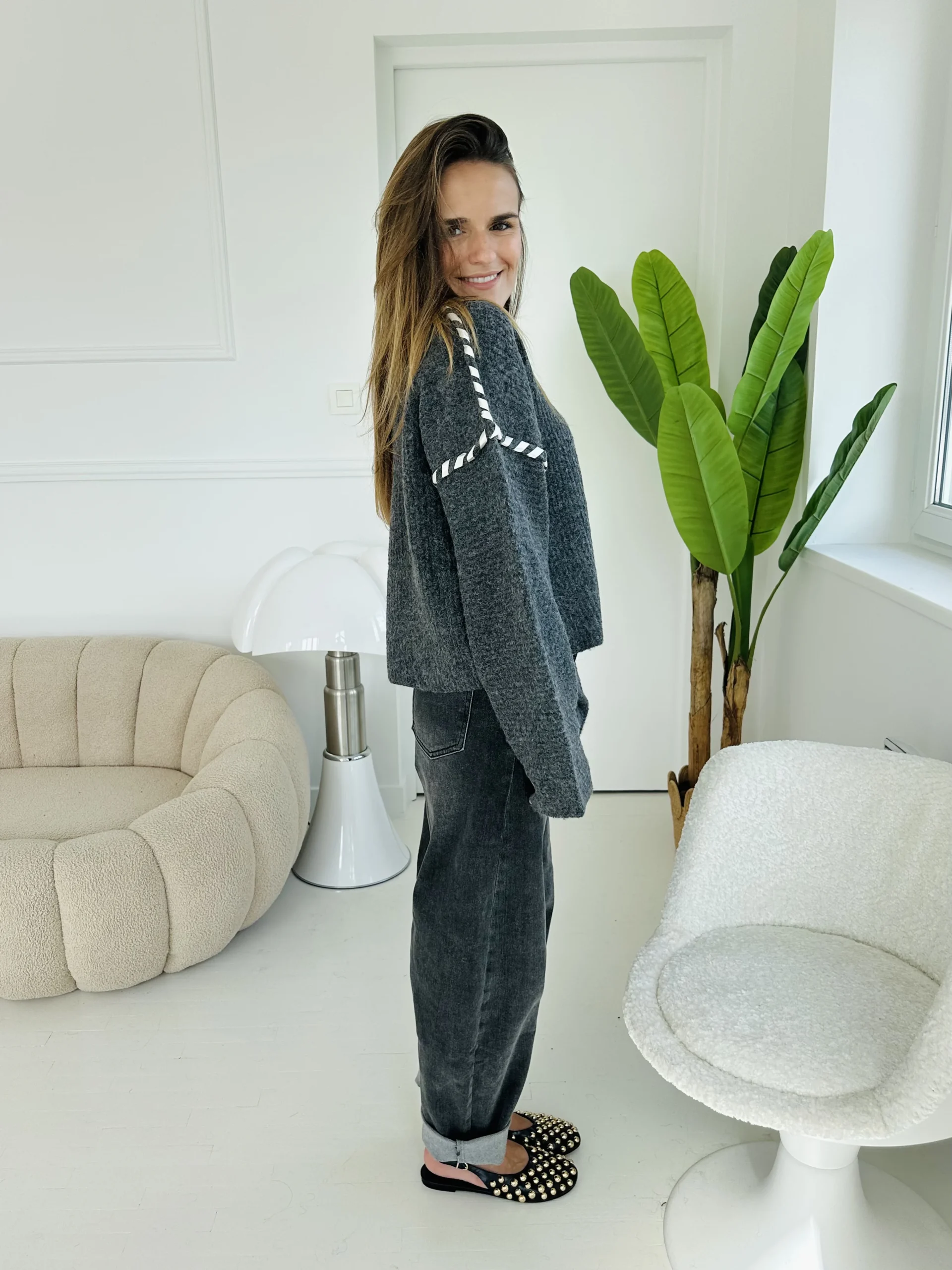 Pull gris, détail ruban au niveau des coutures des emmanchures et du col.