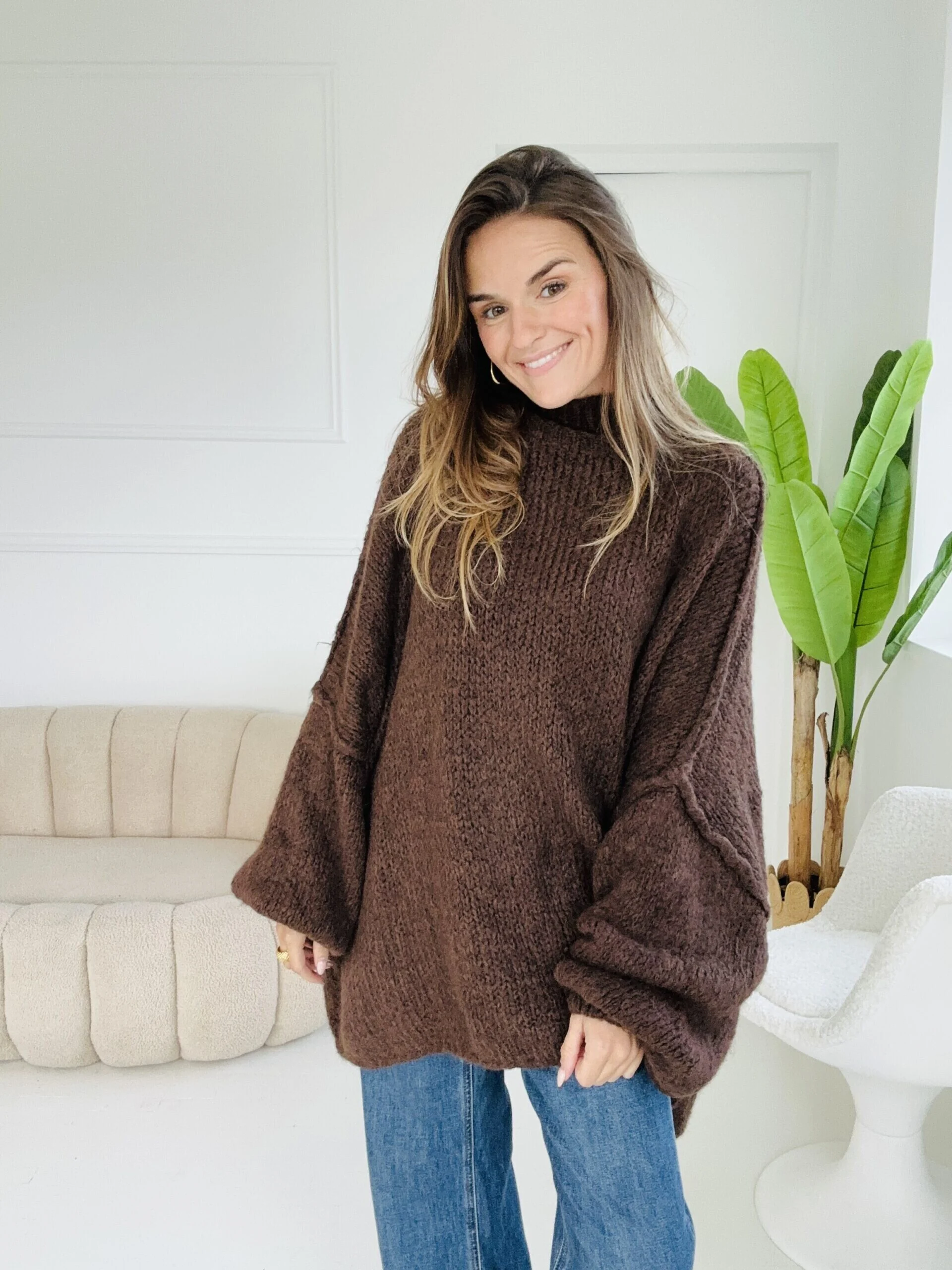 Pull oversize chocolat très confortable. Col montant, détail couture apparente aux emmanchures.