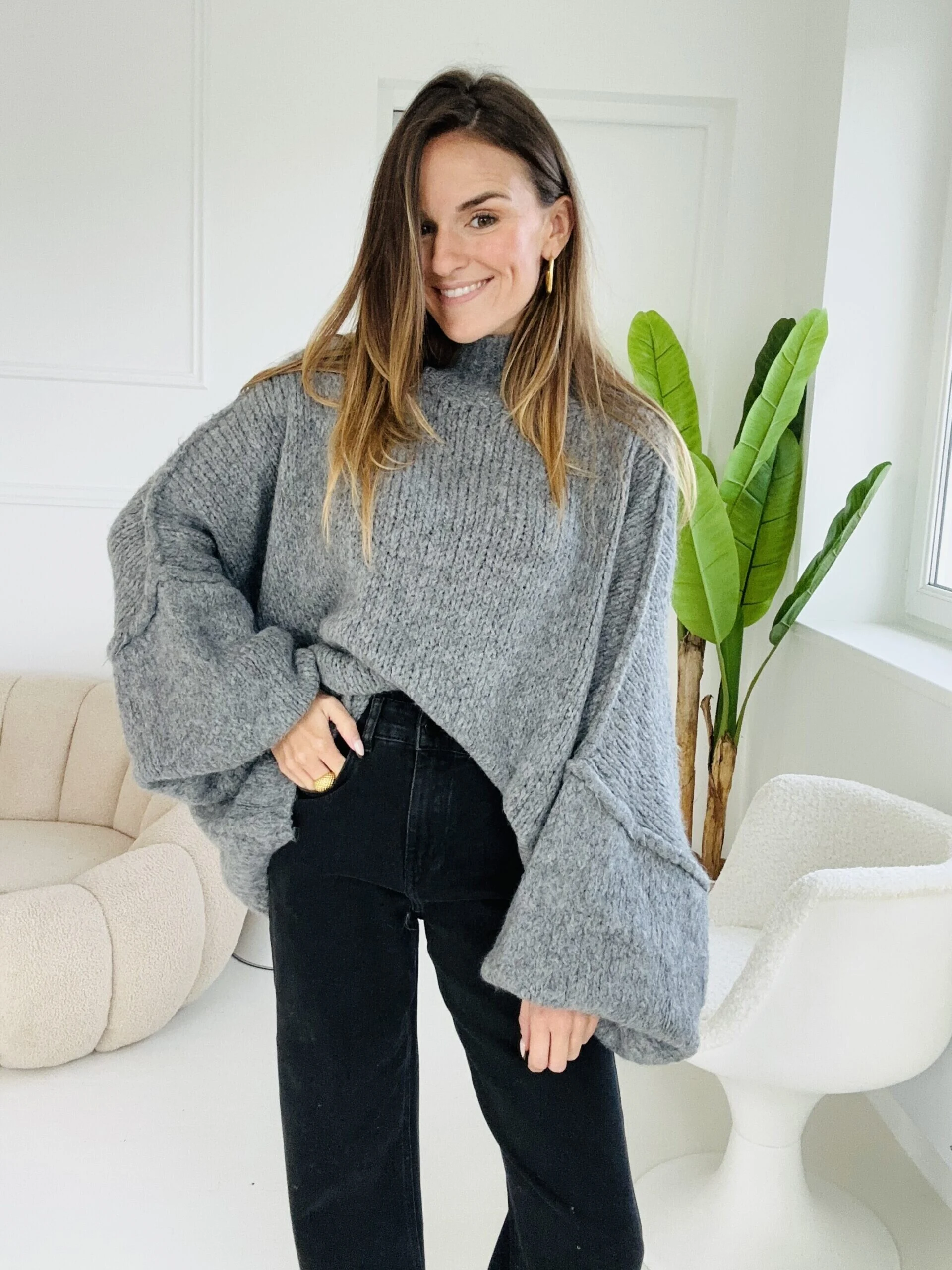 Pull oversize gris très confortable. Col montant, détail couture apparente aux emmanchures.