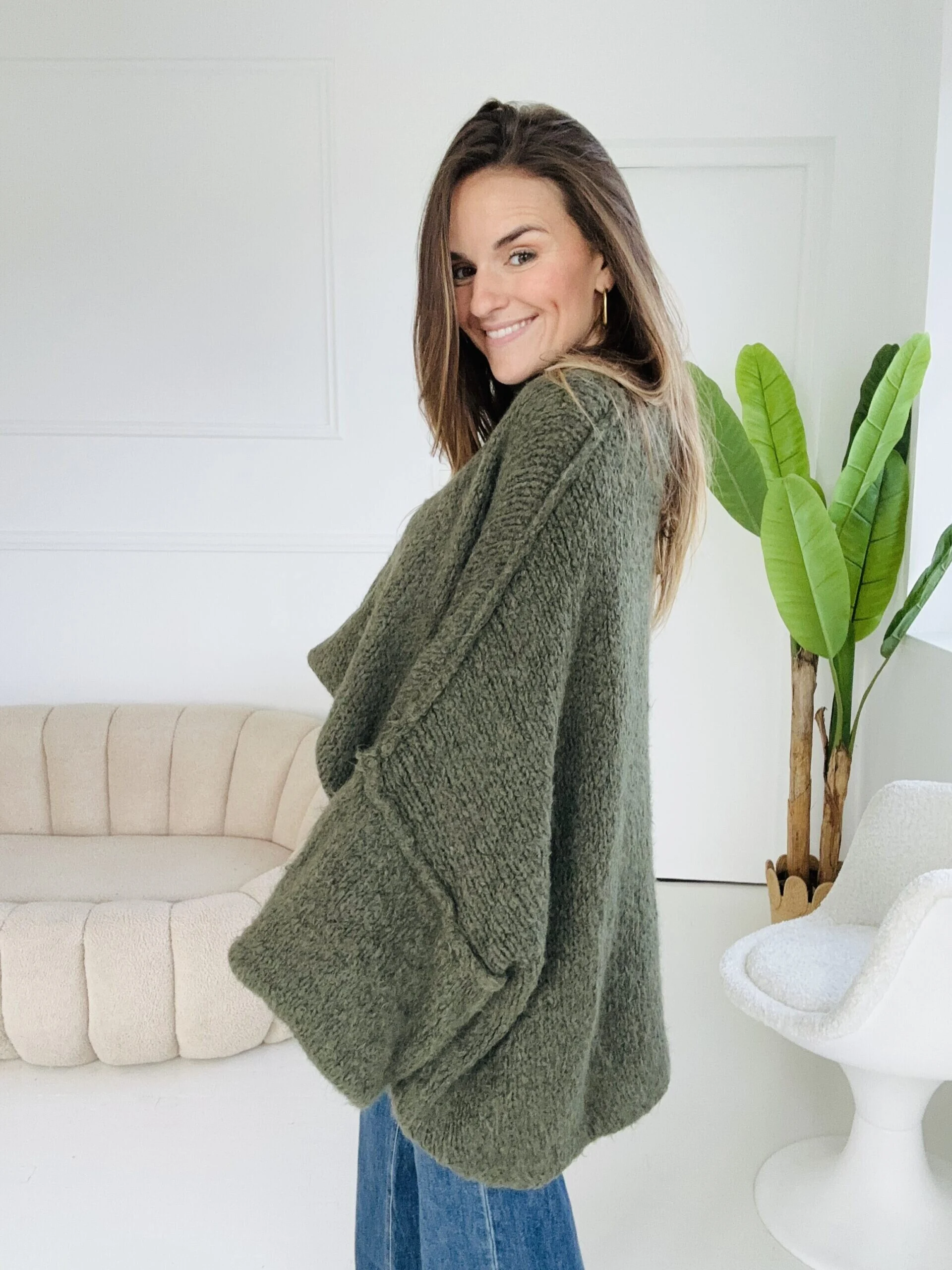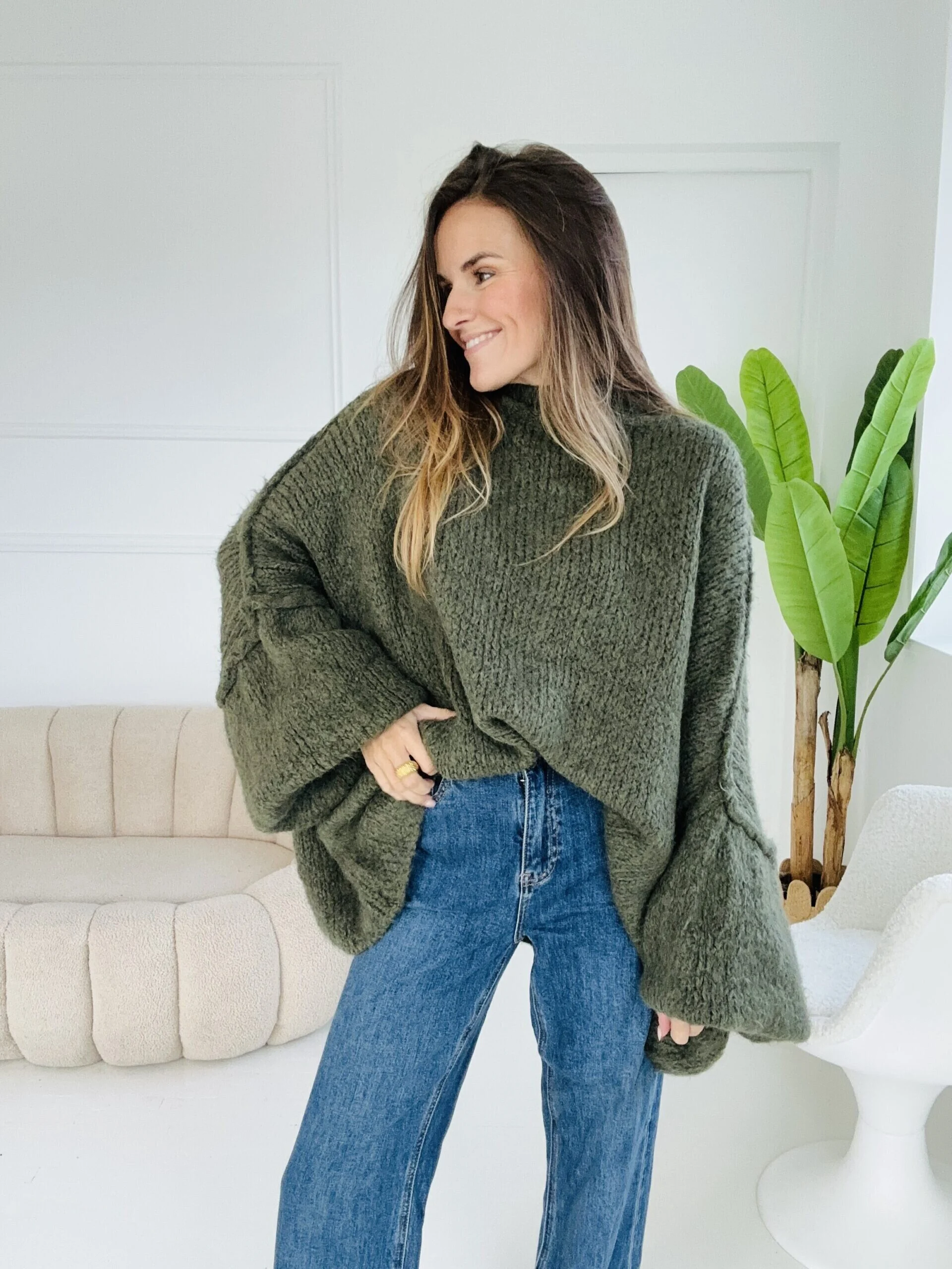 Pull oversize kaki très confortable. Col montant, détail couture apparente aux emmanchures.