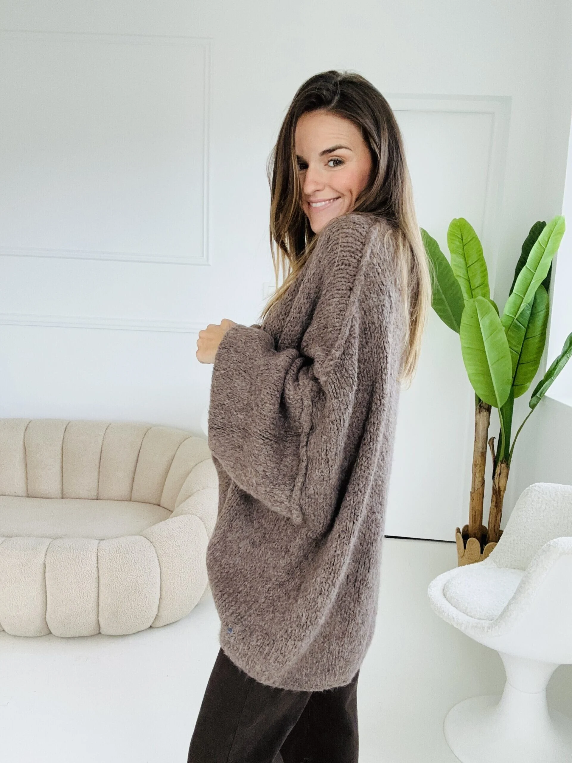 Pull oversize taupe très confortable. Col montant, détail couture apparente aux emmanchures.