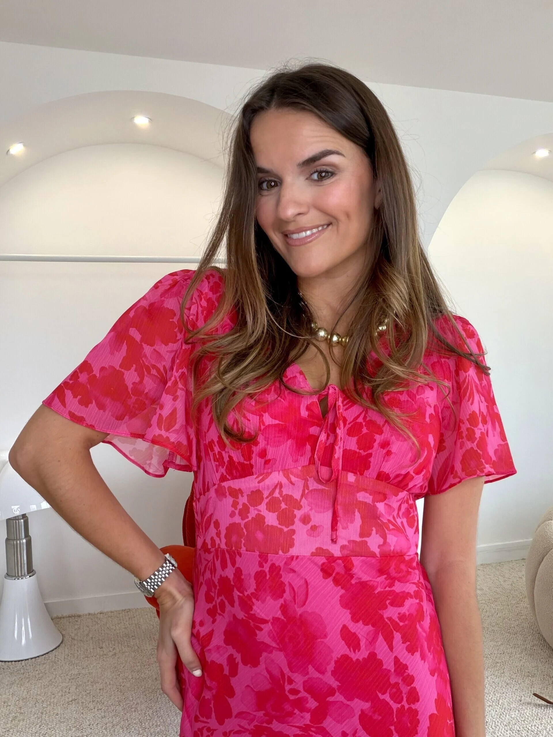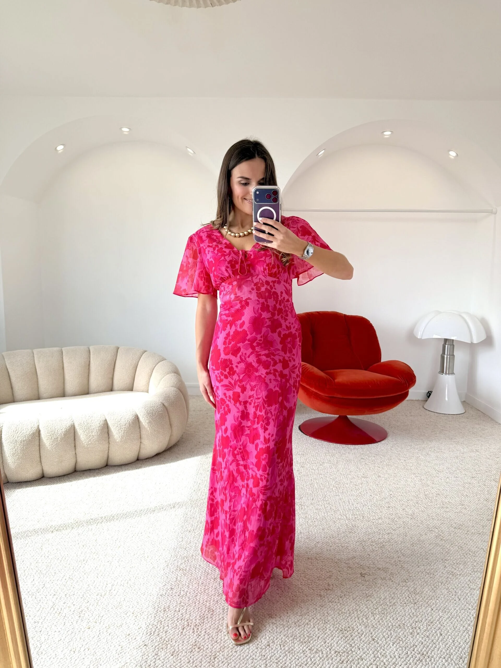 Robe longue rouge/rose fleurie doublée jusqu’en bas. Décolleté en V.