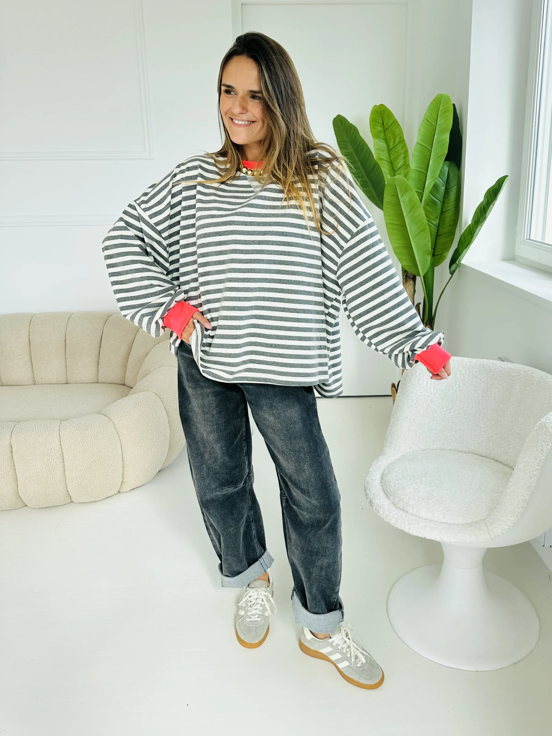 Sweat blanc à rayures grises, détail rose fluo col et poignets.