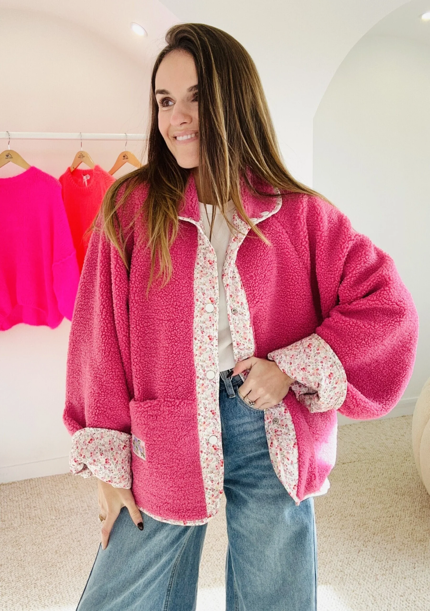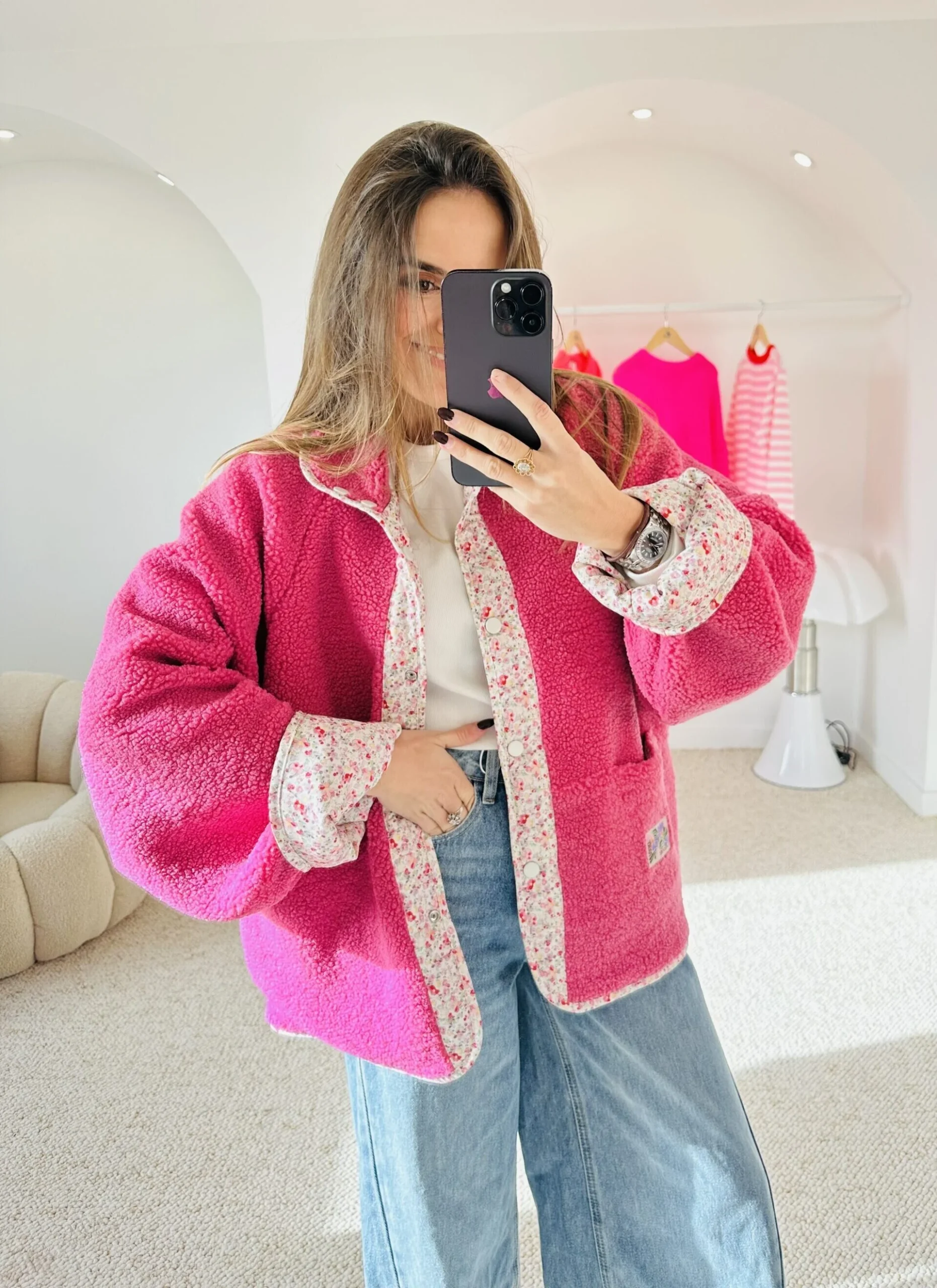 Veste réversible : un coté en tissu liberty matelassé pour un look casual, un coté moumoute douce rose pour une allure cocooning. Deux styles en une seule pièce.