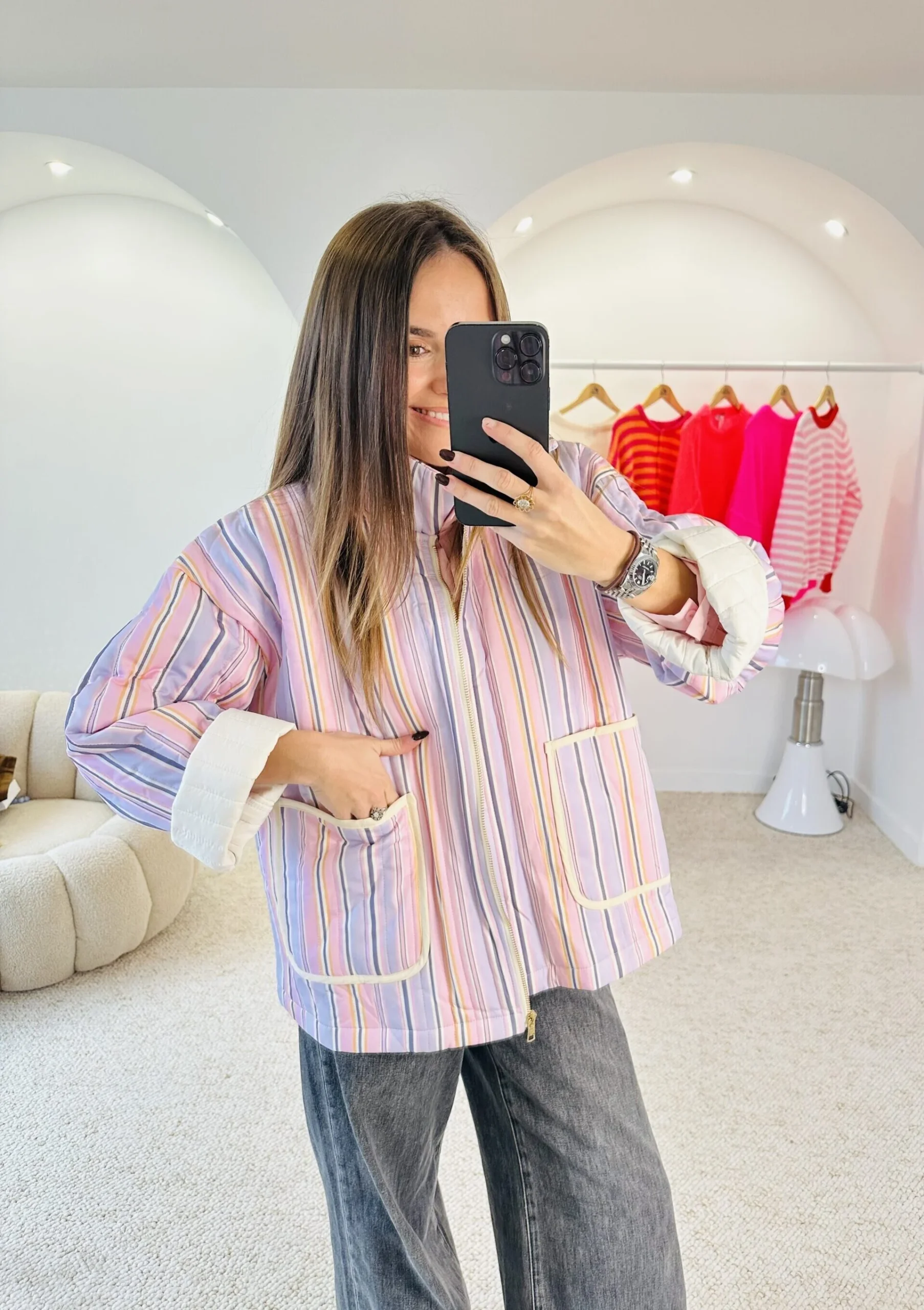 Veste à rayures couleurs pastel (Lila,rose) au style casual chic, dotée d’une fermeture zippée et d’une coupe droite confortable. Une note douce et coloré dans vos looks.